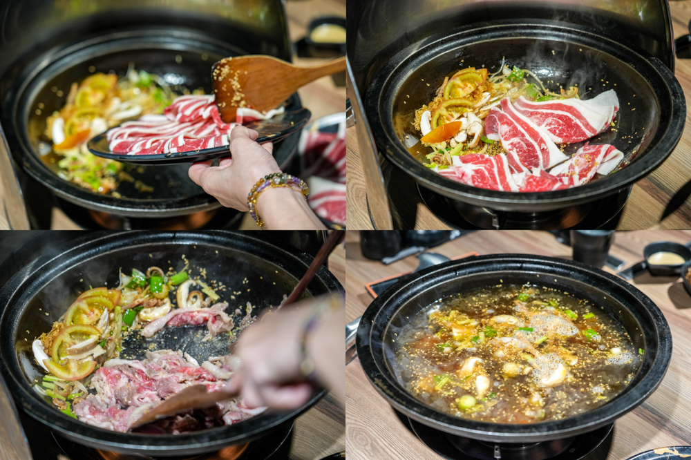 接著放入美國牛五花肉片,我們還把肉量升級成double份,讓味道更濃郁。最後倒入新鮮食材熬煮的高湯,一鍋香噴噴的石頭鍋底就完成了!